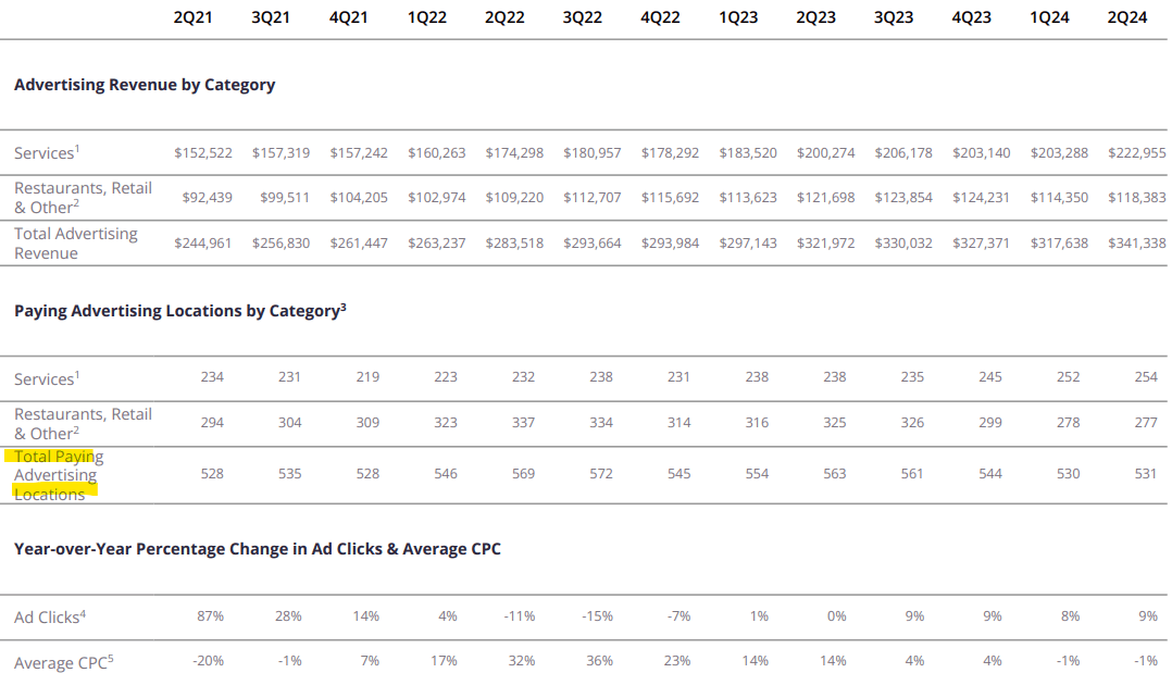 There is also a question of how much more upside there is long-term with services, where despite Yelp managing to generate a higher average revenue per location, the number of providers is relatively constrained by city and region.